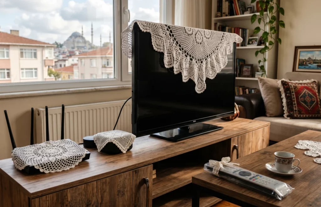 Televizyonun tepesi, modem, hatta bazen kumandalar… Eğer bir eşya elektrikle çalışıyorsa ve üzerine dantel örtülmemişse, o evde henüz tam bir otorite kurulmamış demektir. Dantel, Türk evinde teknolojinin vahşiliğini ehlileştiren bir kalkandır.